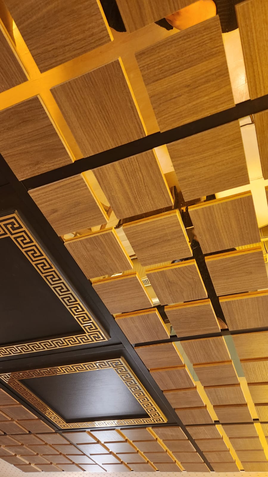 Rölyef Venedik Gold; üç boyutlu rölyef yüzey yapısı, simetrik geometrik formları ve altın tonlarının zarif ışıltısıyla tavanı yalnızca bir kaplama yüzeyi olmaktan çıkarır, mekânın en dikkat çekici mimari unsuruna dönüştürür.